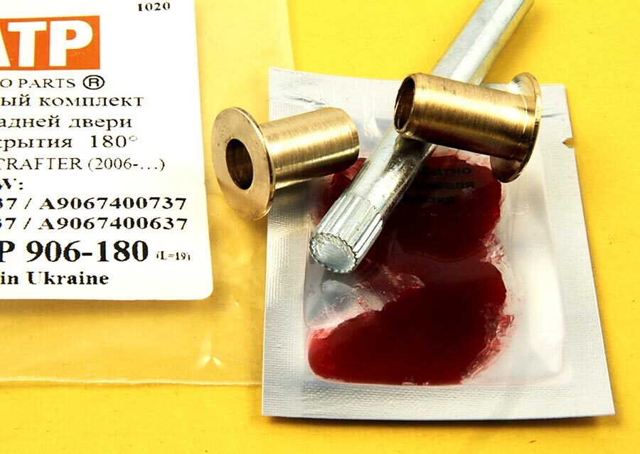 Другой ремкомплект АТР 906-180 предназначен для реставрации петель задних дверей (угол открытия 1800) моделей Mercedes Sprinter 906 (c 2006 …), а также для Volkswagen Crafter (c 2006…).