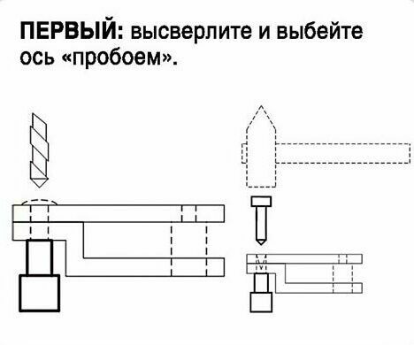 4. Установка новых роликов. При необходимости рассверлить отверстие каретки до 6 мм для роликов компании АТР. После установки роликов в посадочное отверстие необходимо предварительно развальцевать ось с помощью «пробоя» и затем окончательно расклепать умеренными ударами молотка.